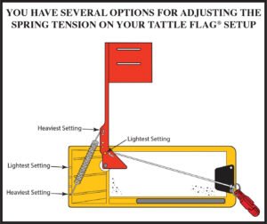 The spring settings on the Tattle Flag® allow anglers to set a proper amount of tension suitable for all common trolling lures and hardware. The flag itself has several different holes pre-drilled for the spring and the front of the board also features several pre-drilled tension setting holes. For example, to get the heaviest tension from the spring hook the rounded end of the spring into the highest hole going up the shaft of the flag and hook the other end into the lowest hole in the board. This will allow you to pull heavier weights such as 150’ of weighted copper/steel line, Off Shore Tackle’s OR36 #3 Tadpoles, deep diving crankbaits, and many others.